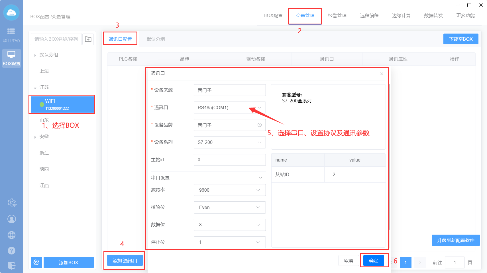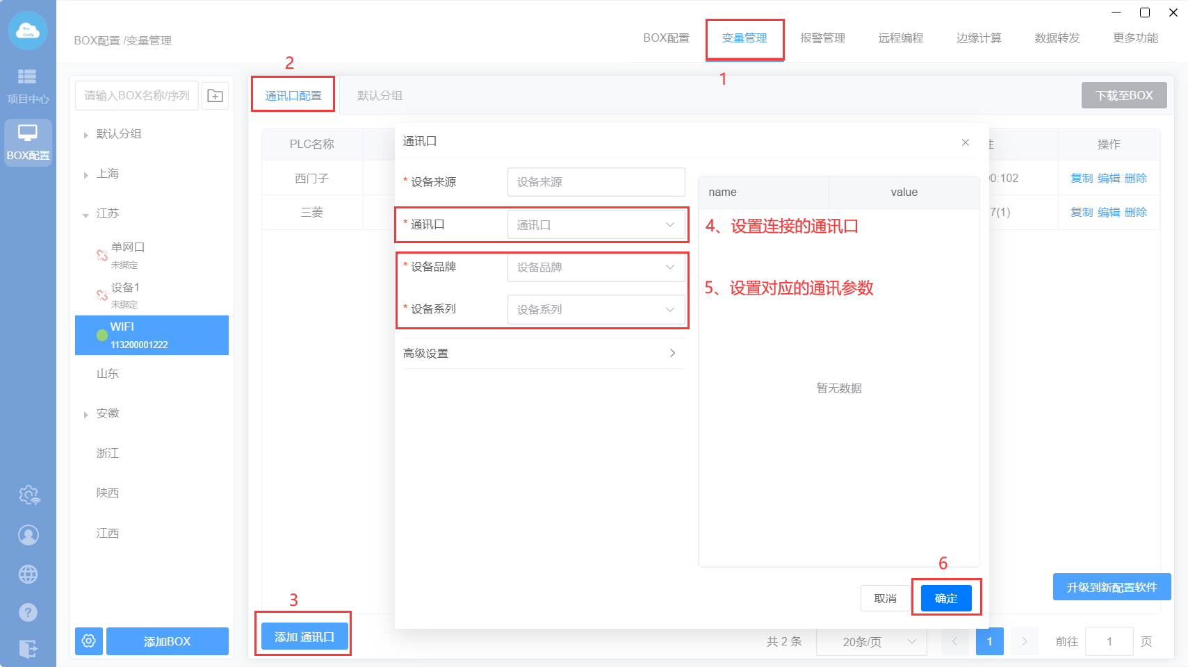BOX配置:配置BOX参数以及通讯设置的地方;