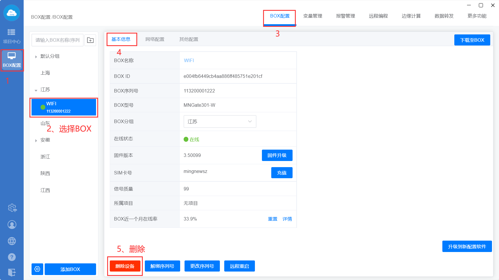 进入【BOX配置】—>【基本信息】,点击“删除设备”