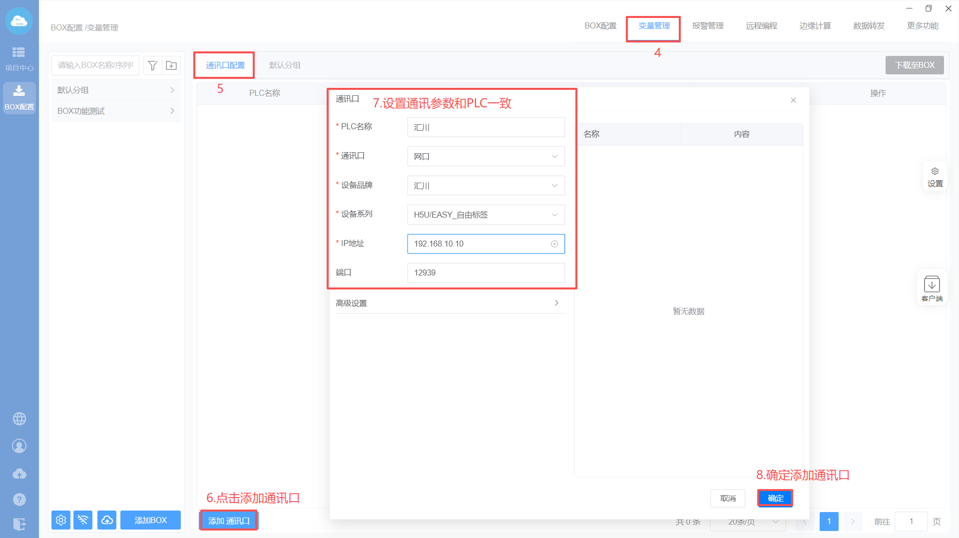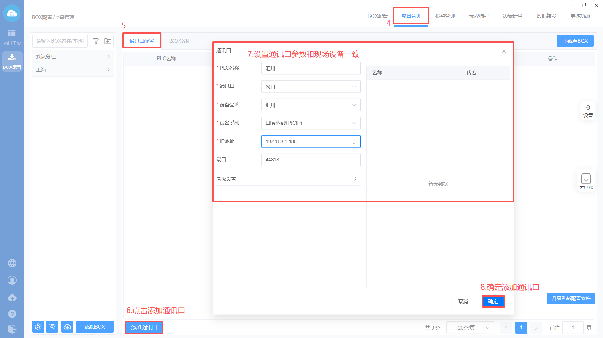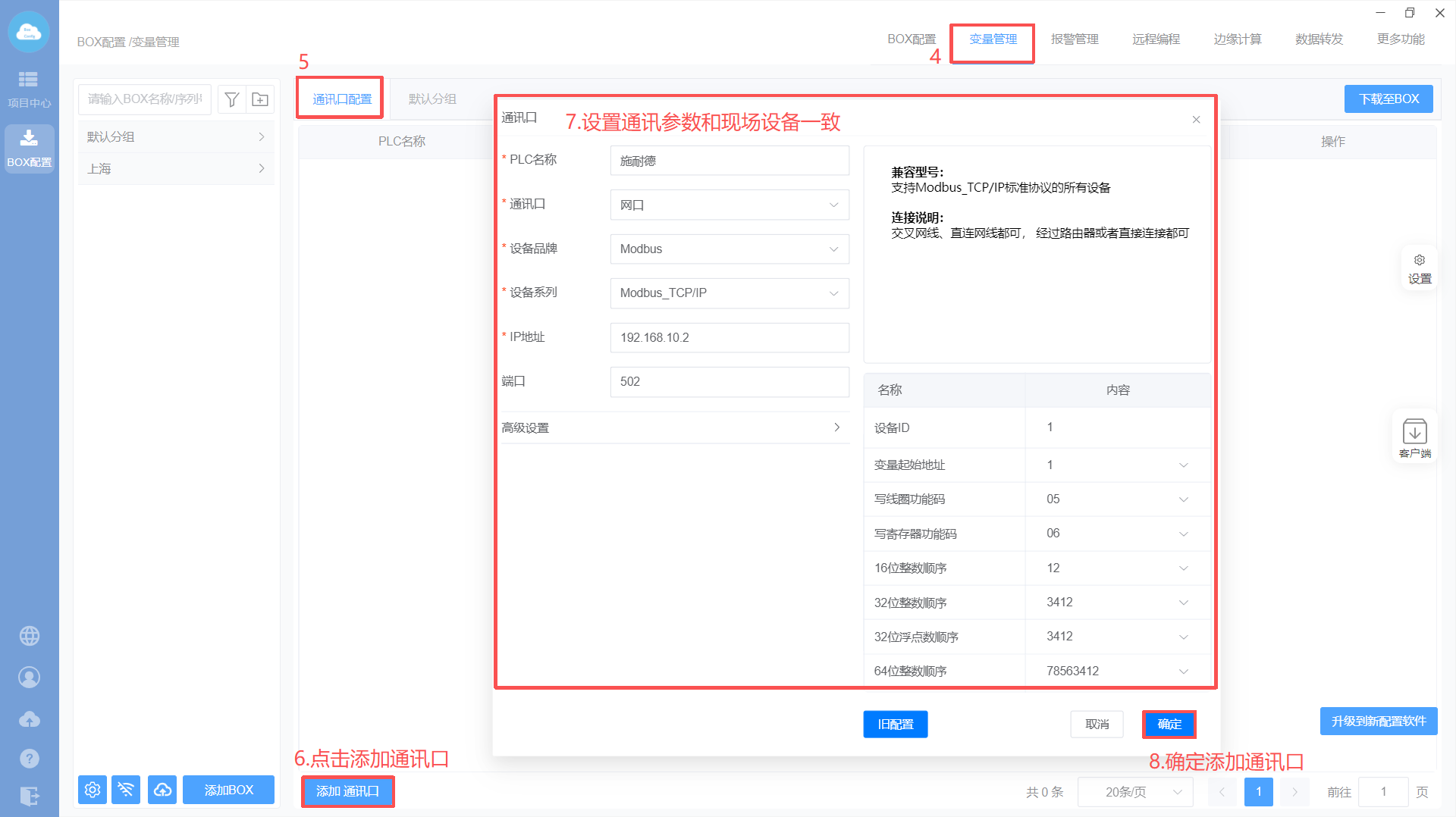Box配置(注意:修改box参数,与PLC保持在同一网段)