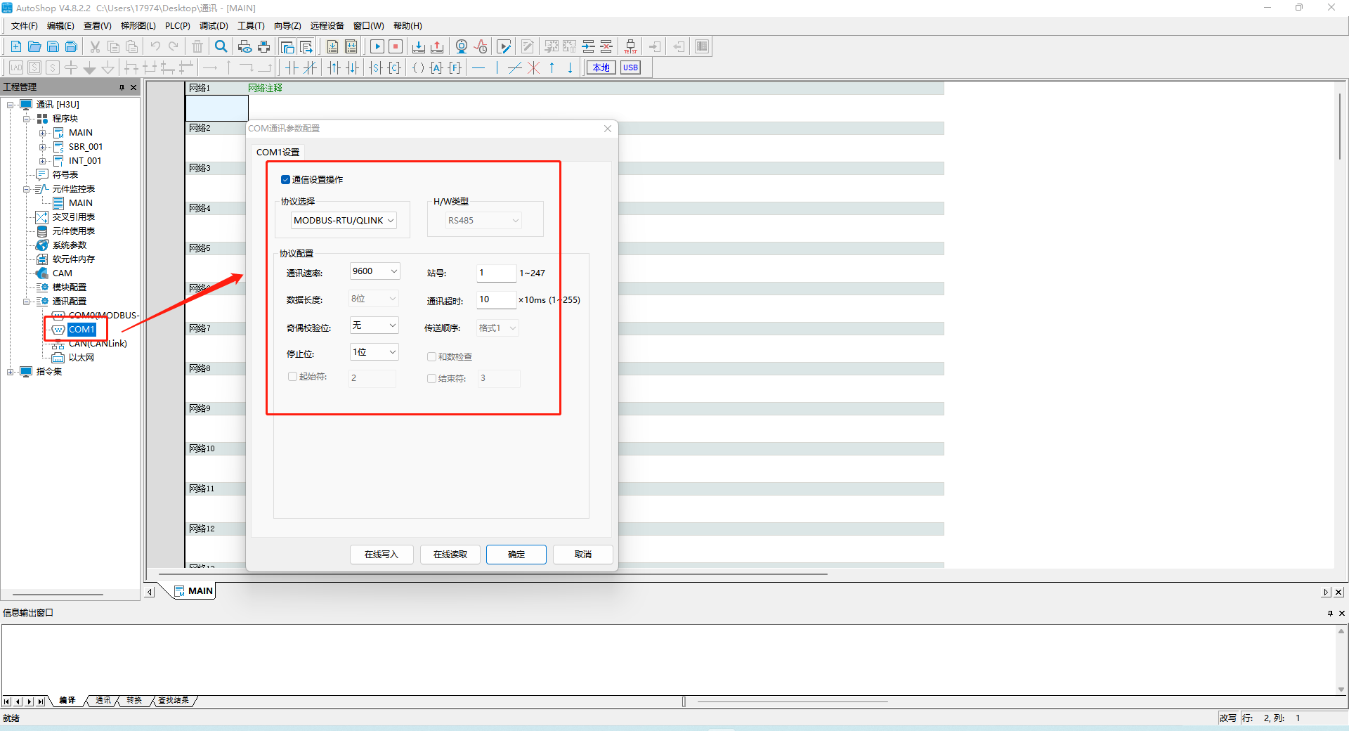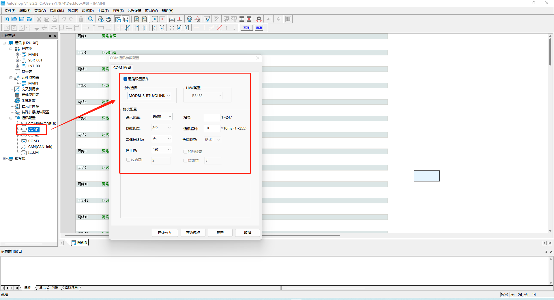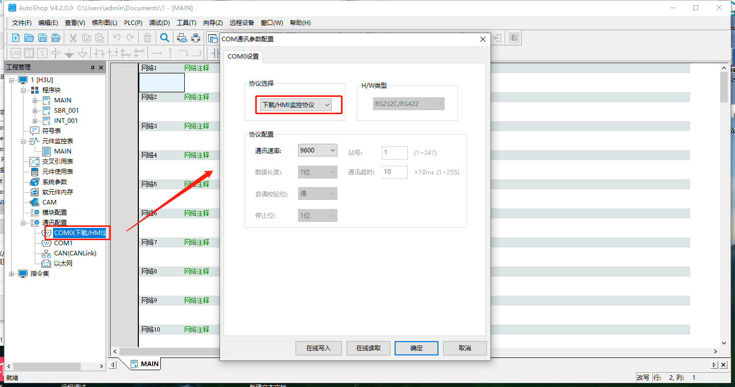 在AutoShop软件中设置对应com口为下载/HMI监控协议