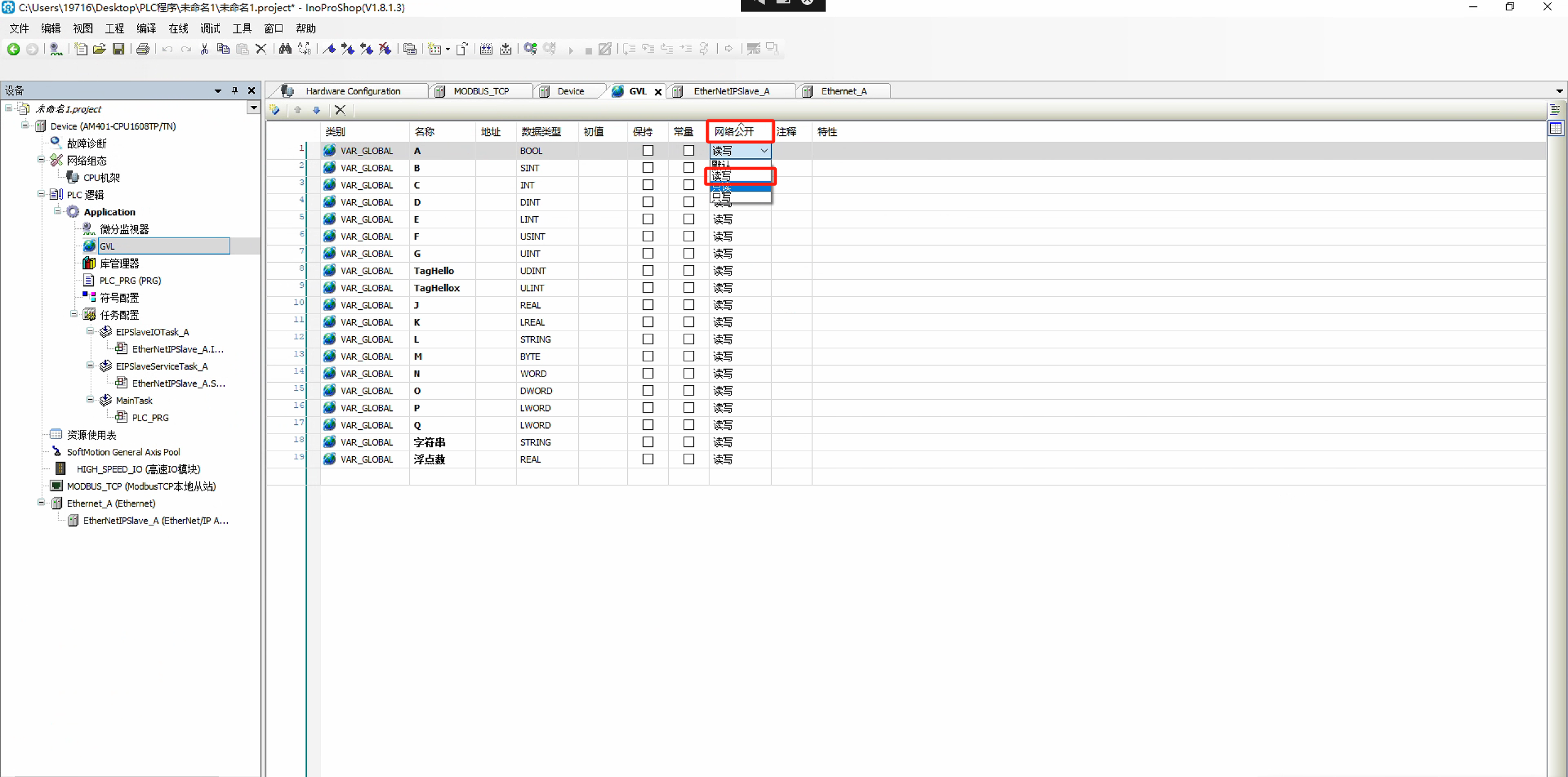 (2)添加全局变量,并且把变量“网络公开”设置成“读写”。