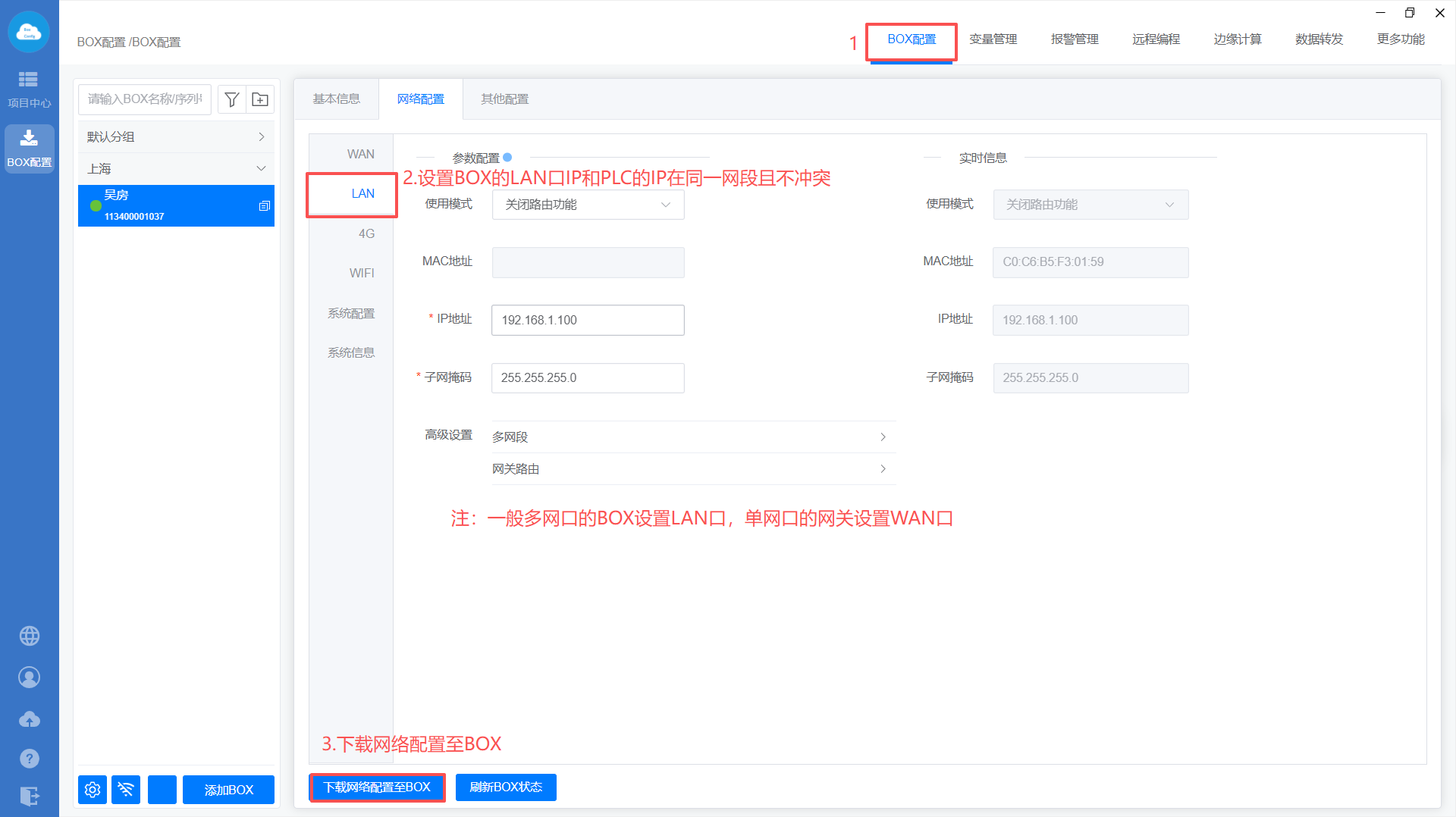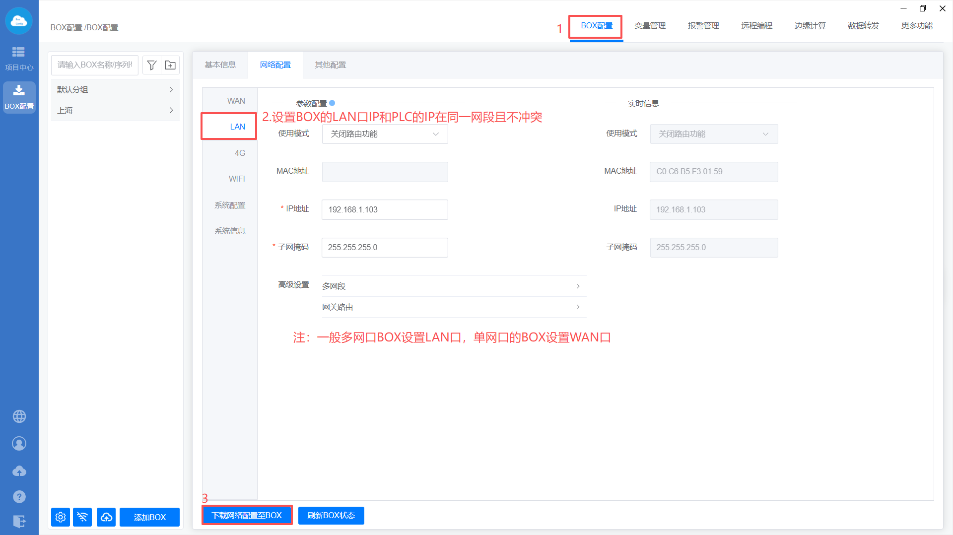- Box配置(注意:修改box参数,与PLC保持在同一网段)