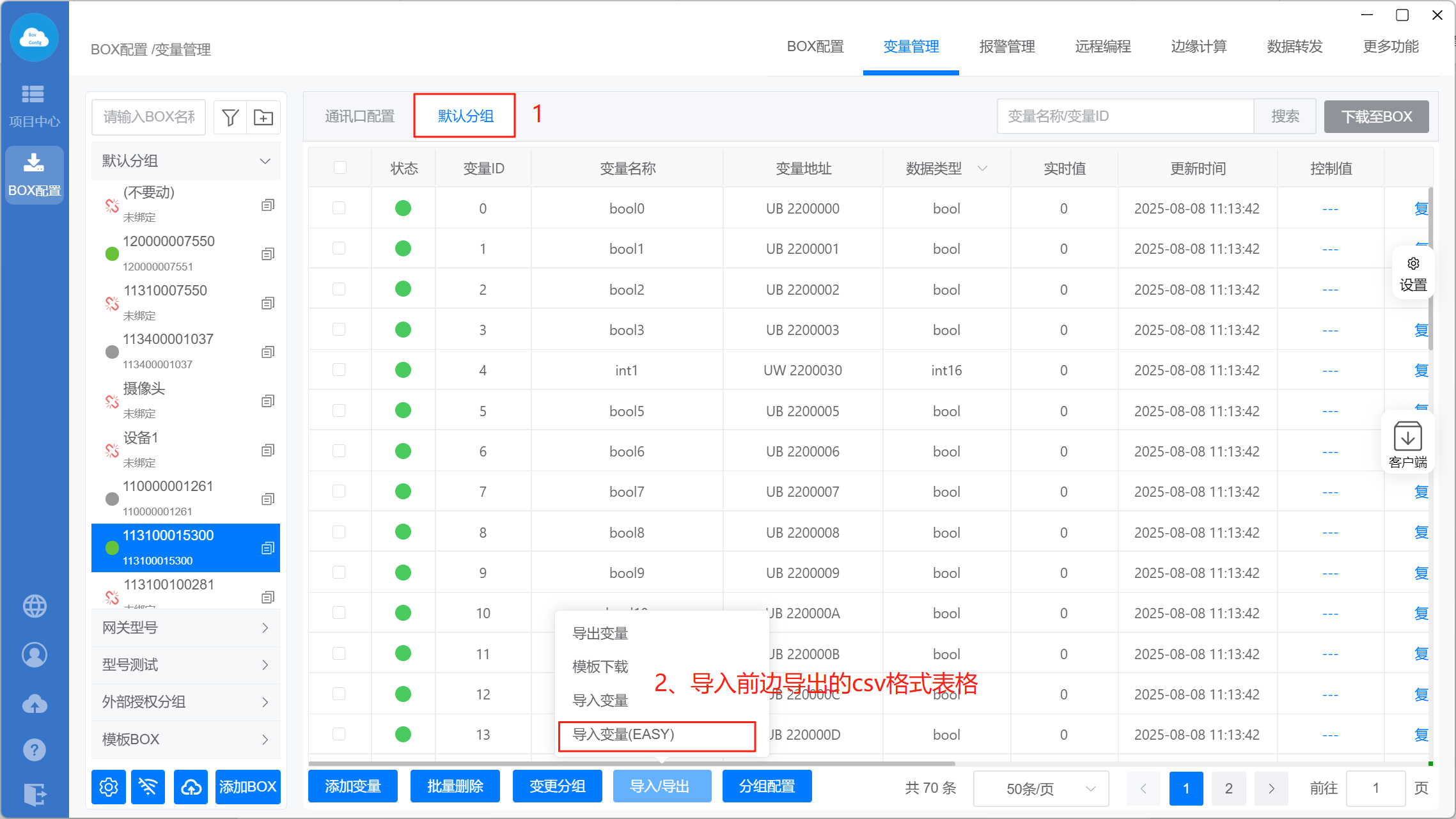 通过“导入变量(EASY)”直接导入csv格式变量点表。