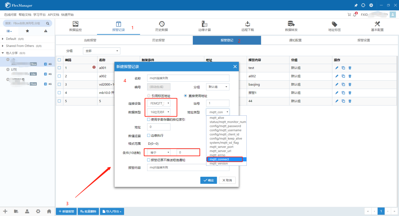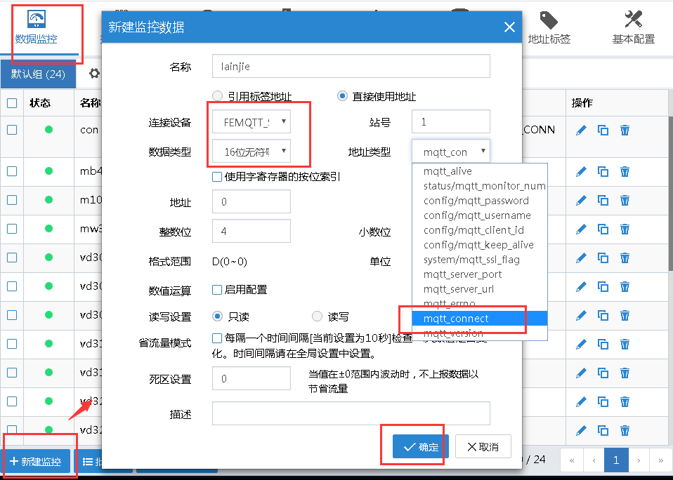 (1)【数据监控】中添加地址类型为“mqtt_connect”的监控点,