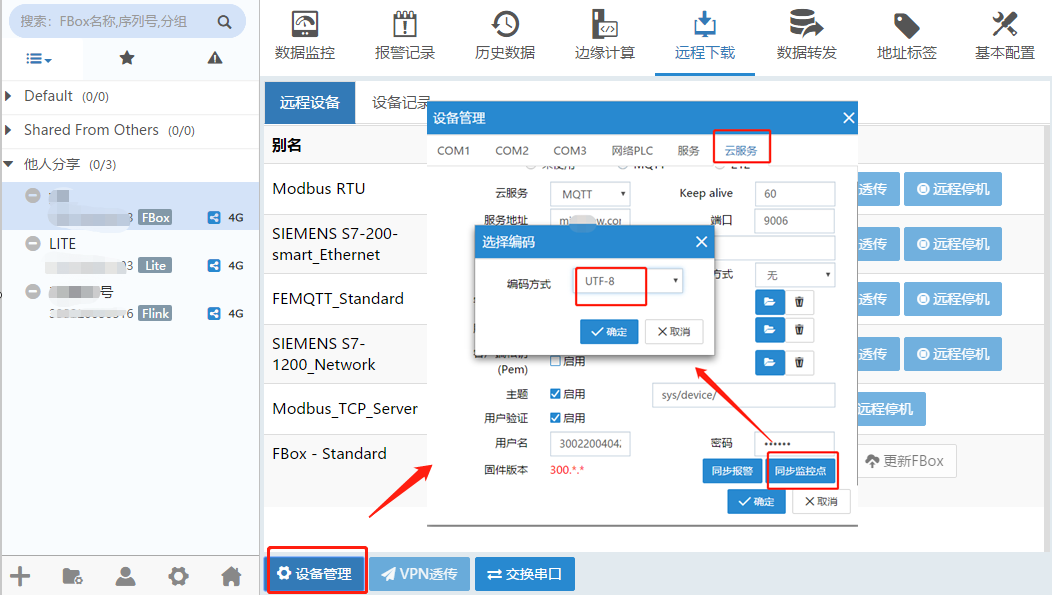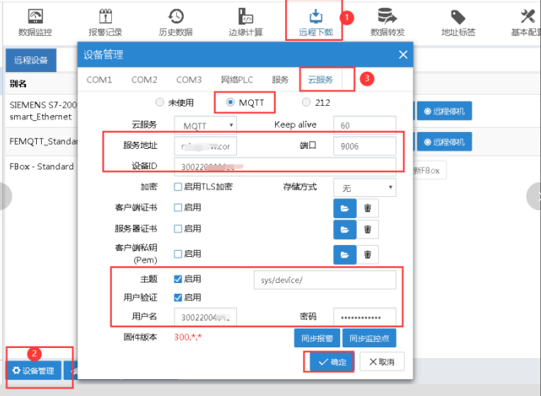 在“远程下载-->设备管理-->云服务”中配置 MQTT 推送的服务器地址、端口号、设备 ID、登录用户名与密码等信息。