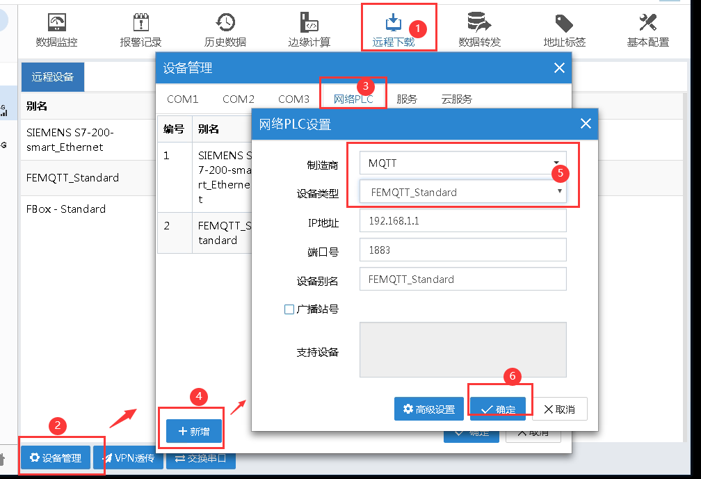 在 FlexManager 的“远程下载-->设备管理—>网络 PLC”中创建 MQTT 连接设备,如图设置: