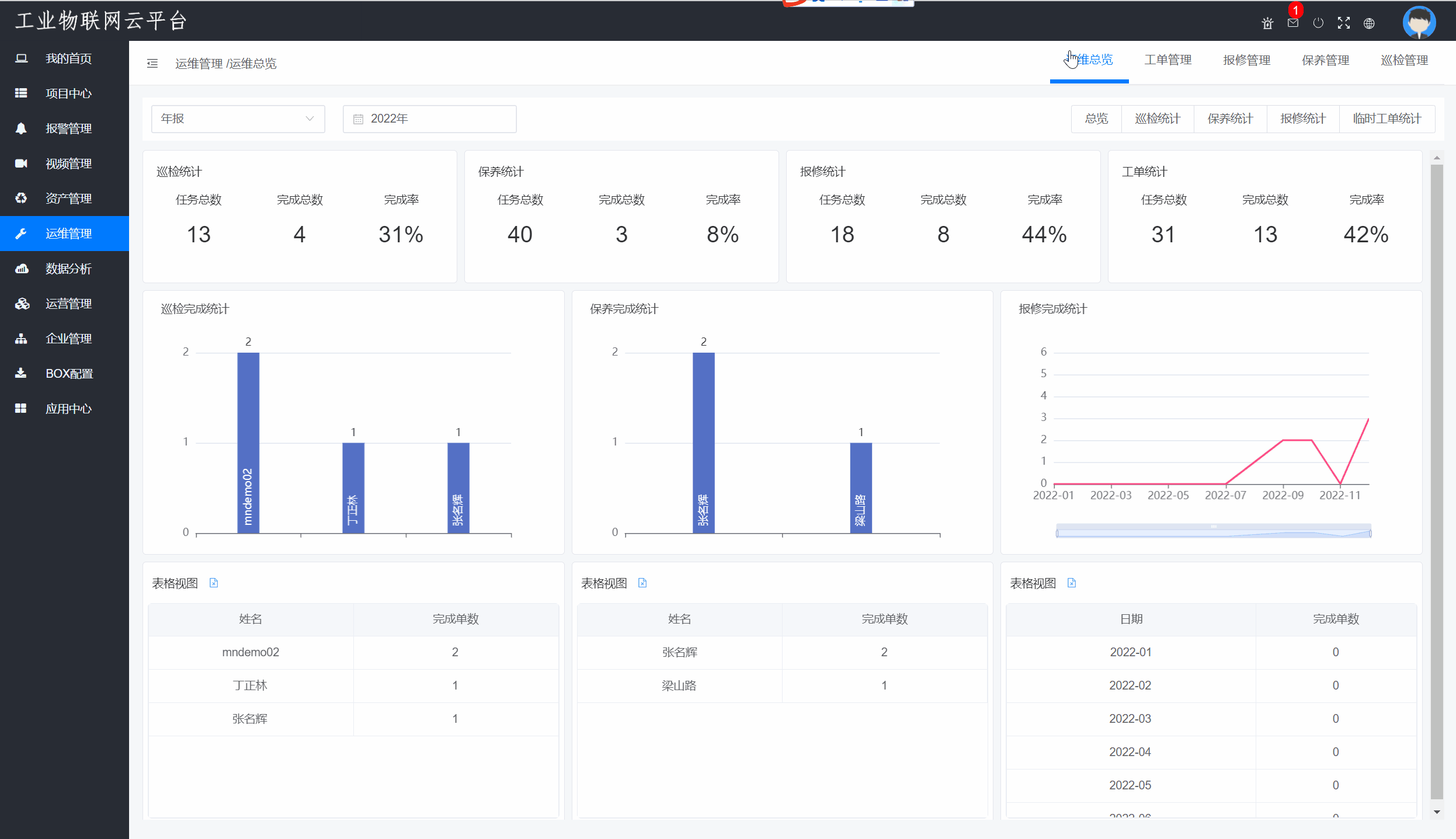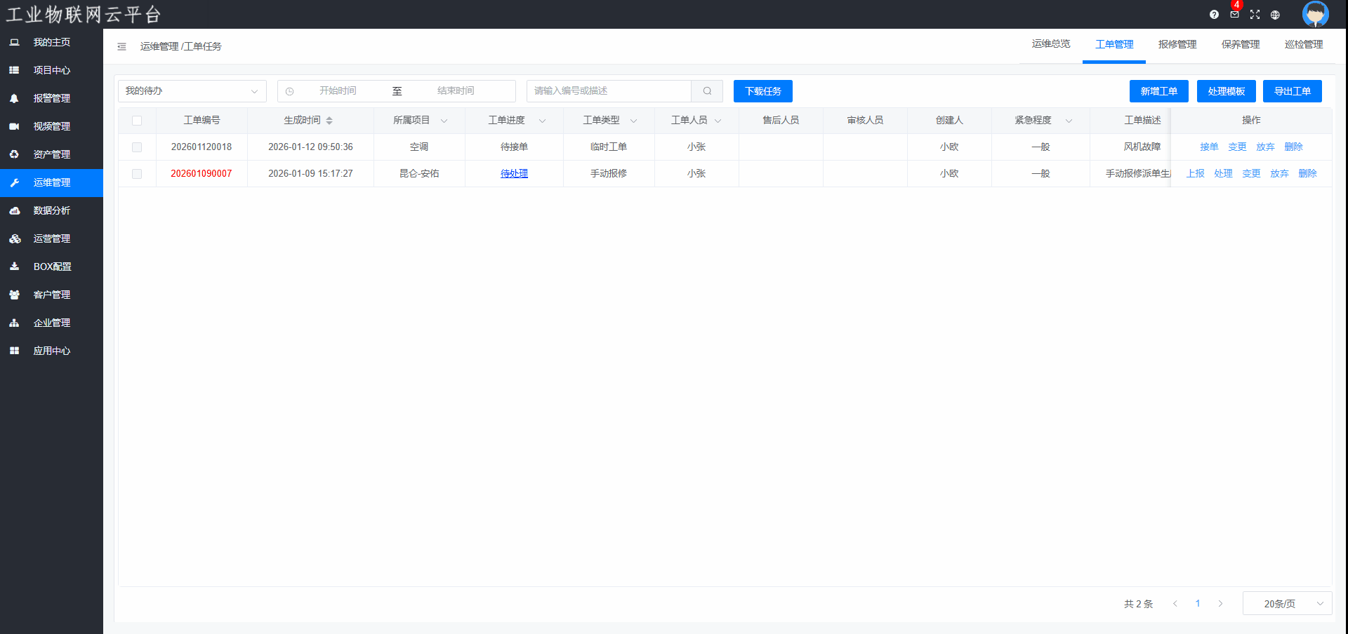 内置设备巡检、保养、报修、工单、巡查等模块;