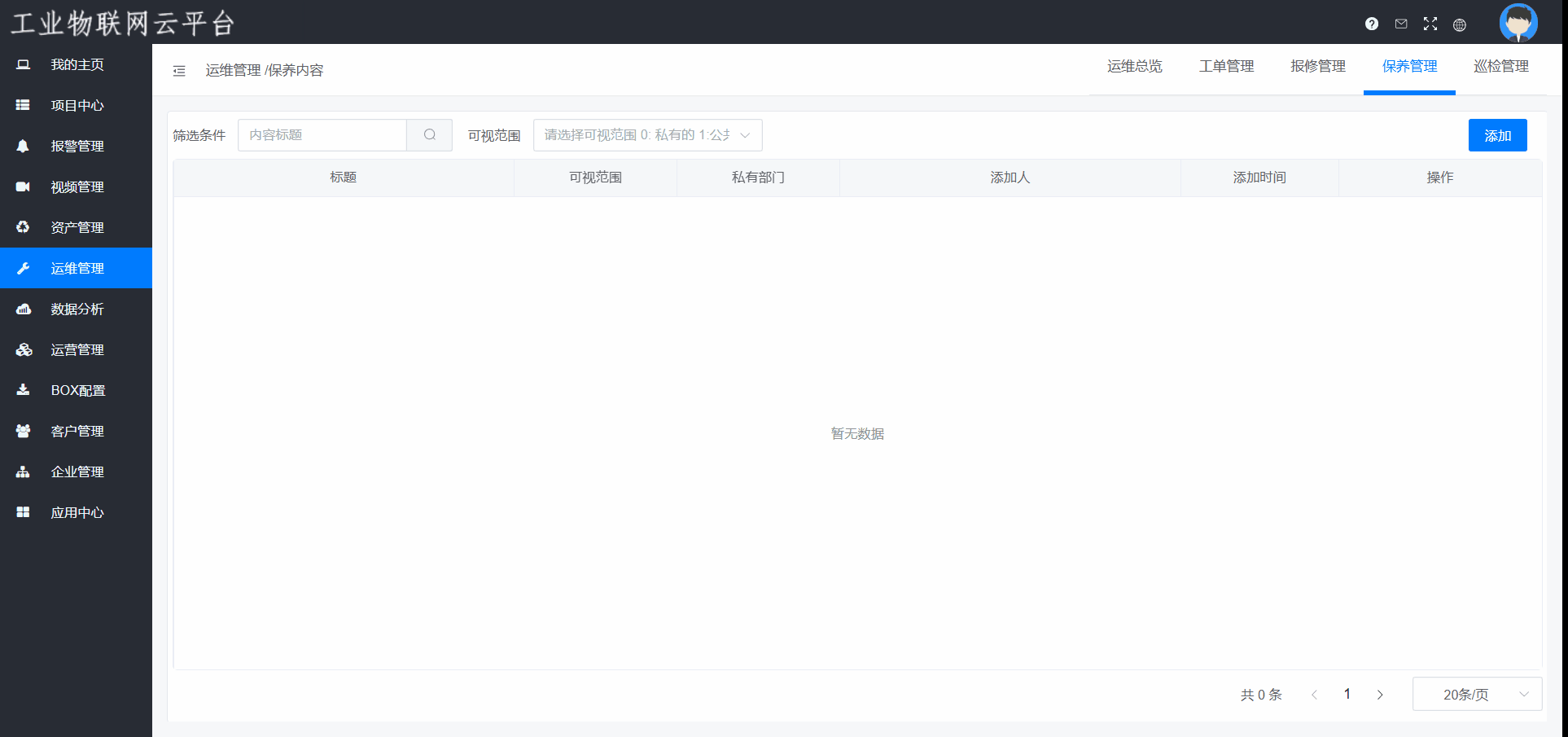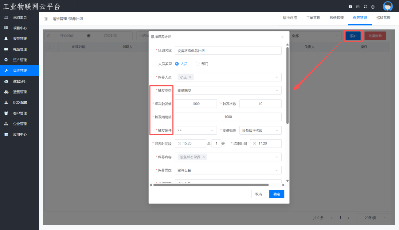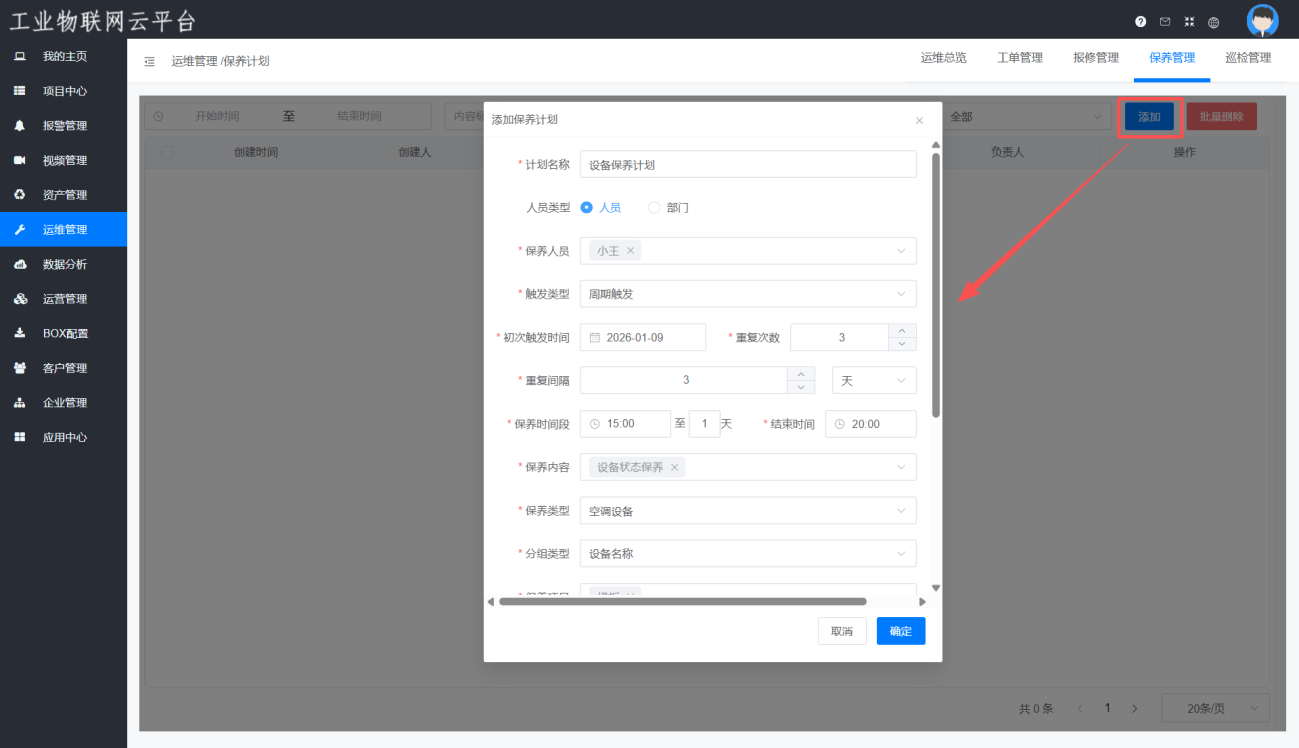 进入【运维管理】—>【保养管理】—>【保养计划】,点击添加按钮