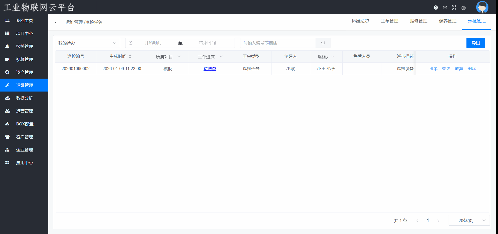 进入【巡检管理】—>【巡检任务】中,我的待办,进行接单—>处理—>完成,操作步骤如下: