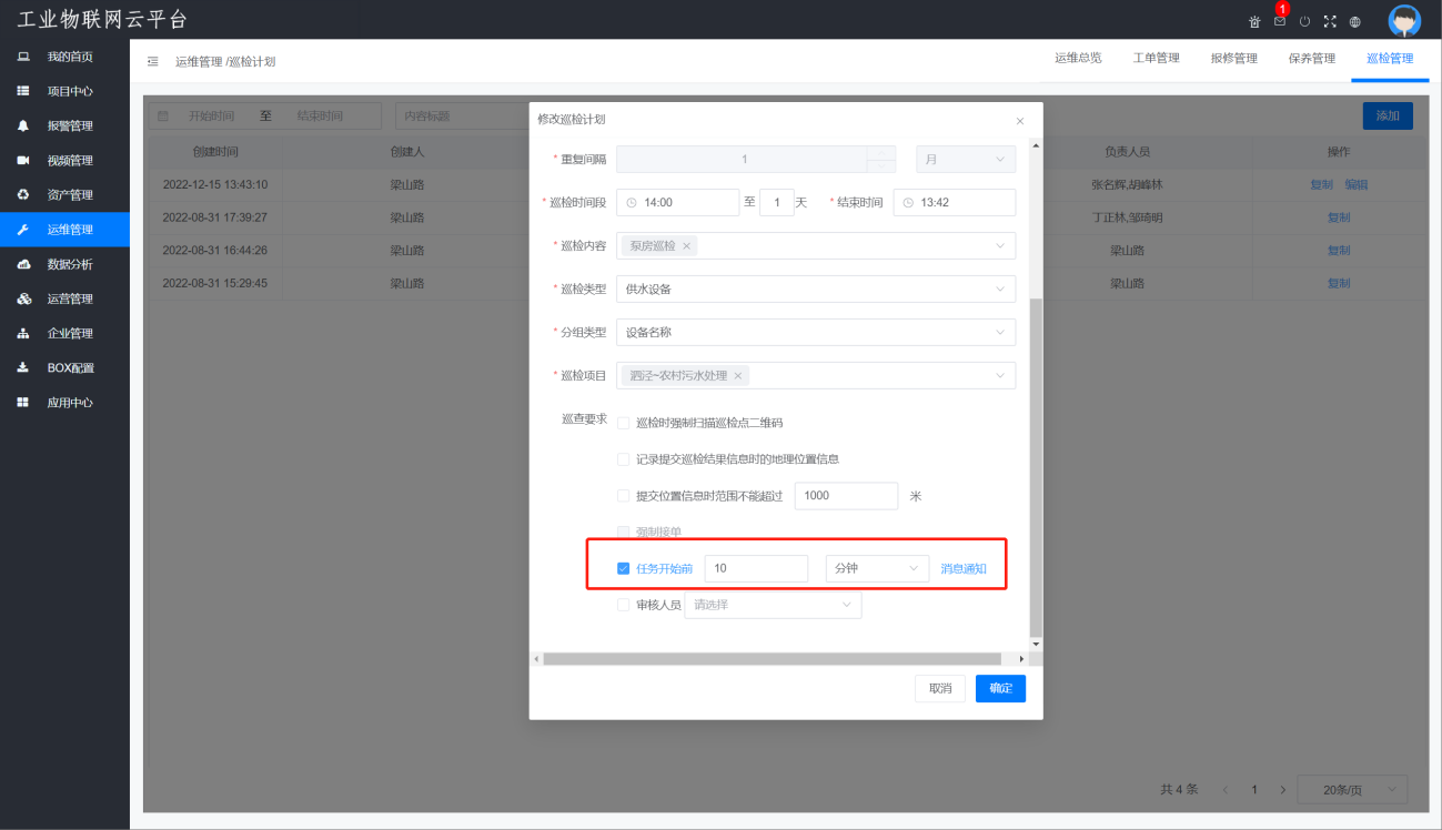 巡检工单:需要任务开始前X分钟通知,在任务开始前X分钟通知;