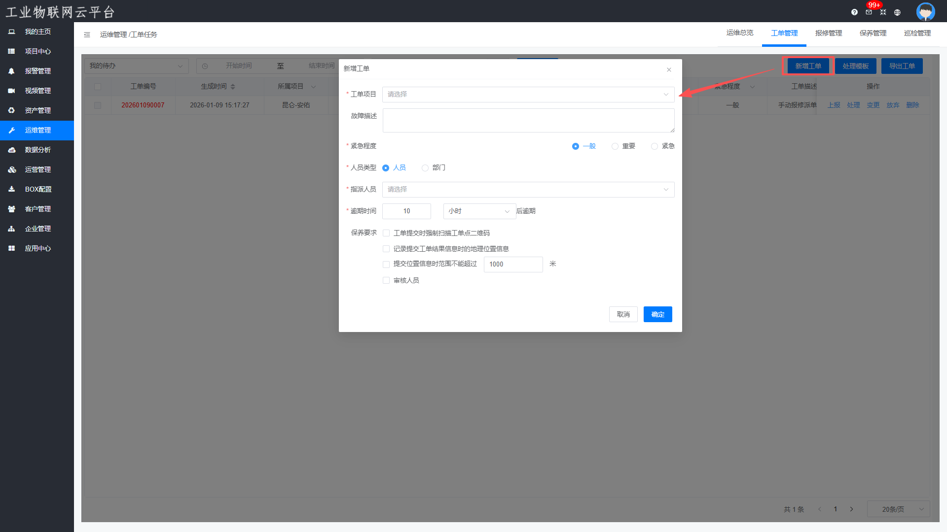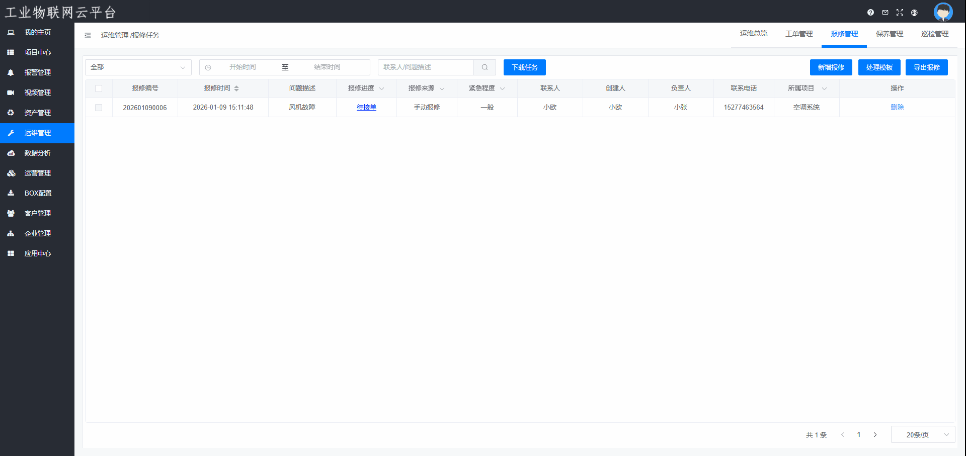 进入【运维管理】-【报修管理】,点击“创建报修”—>派单