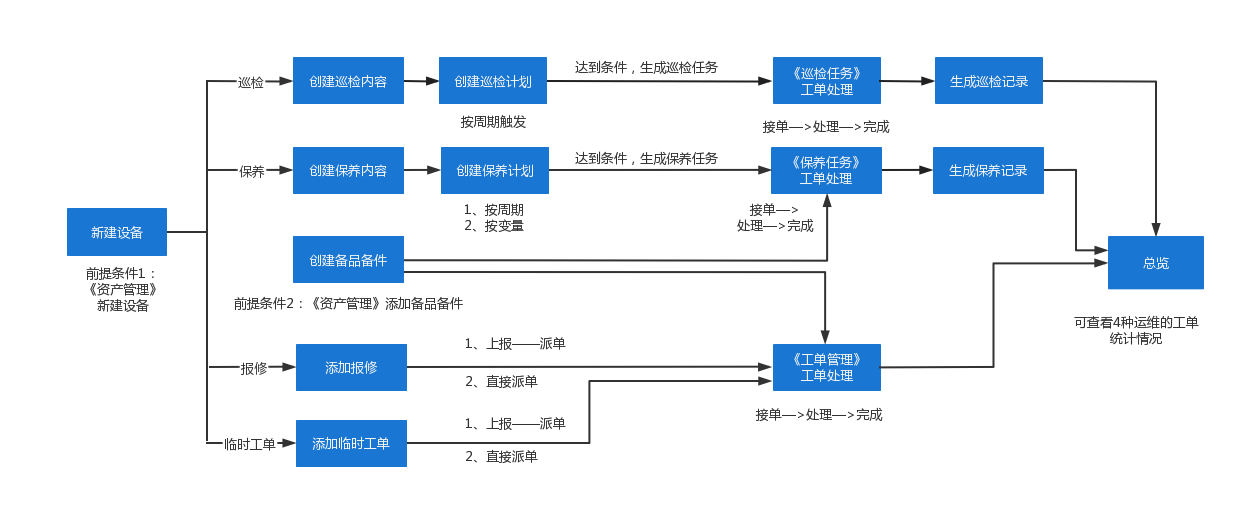 创建保养内容—>创建保养计划—>自动生成保养任务—>工单处理—>生成保养记录