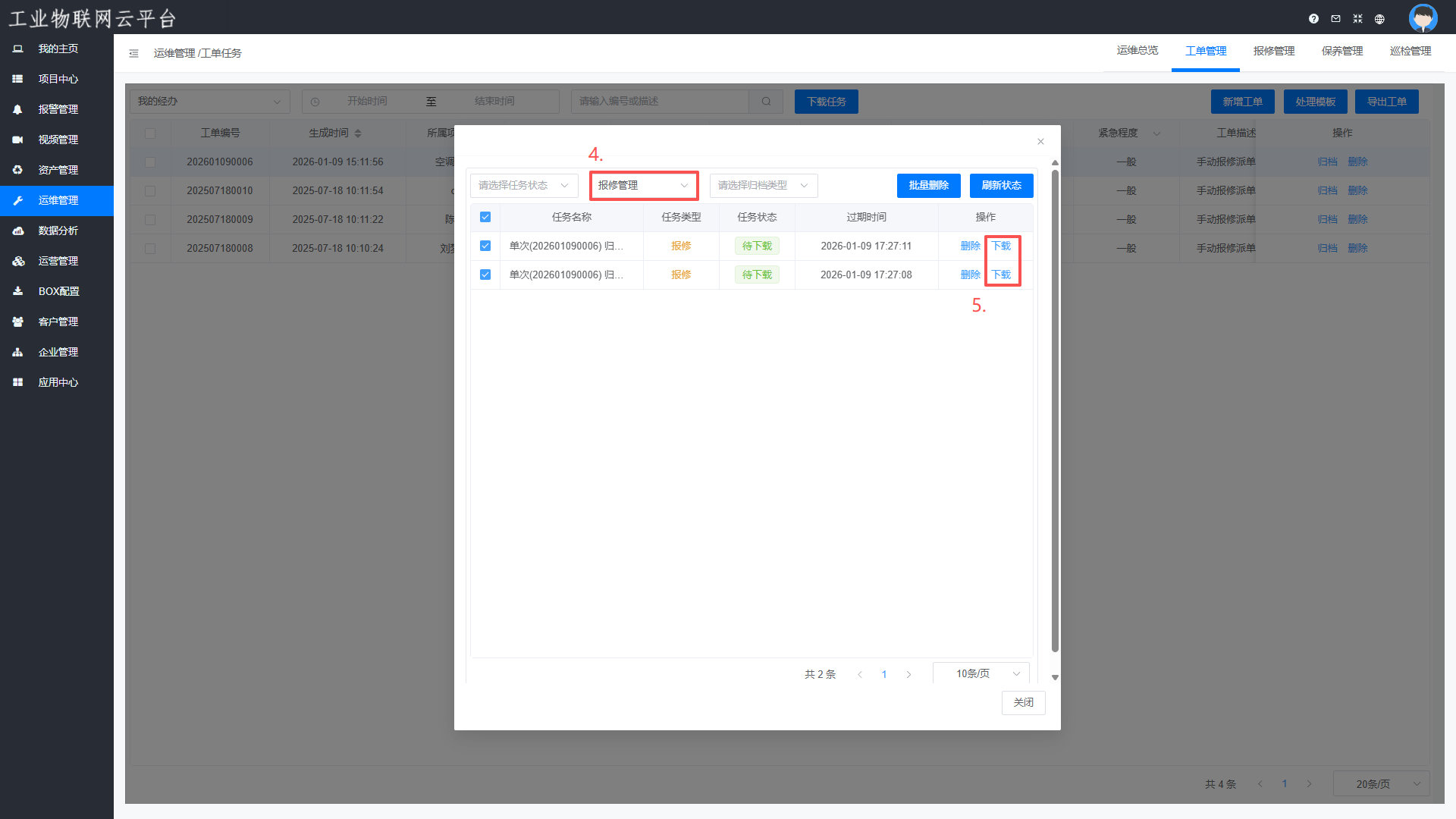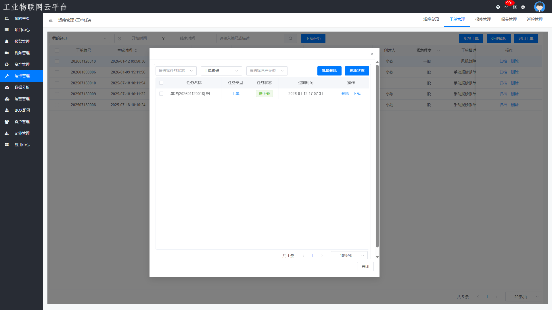 - 下载任务:可以查看归档/导出的工单状态,并进行下载或删除的操作。