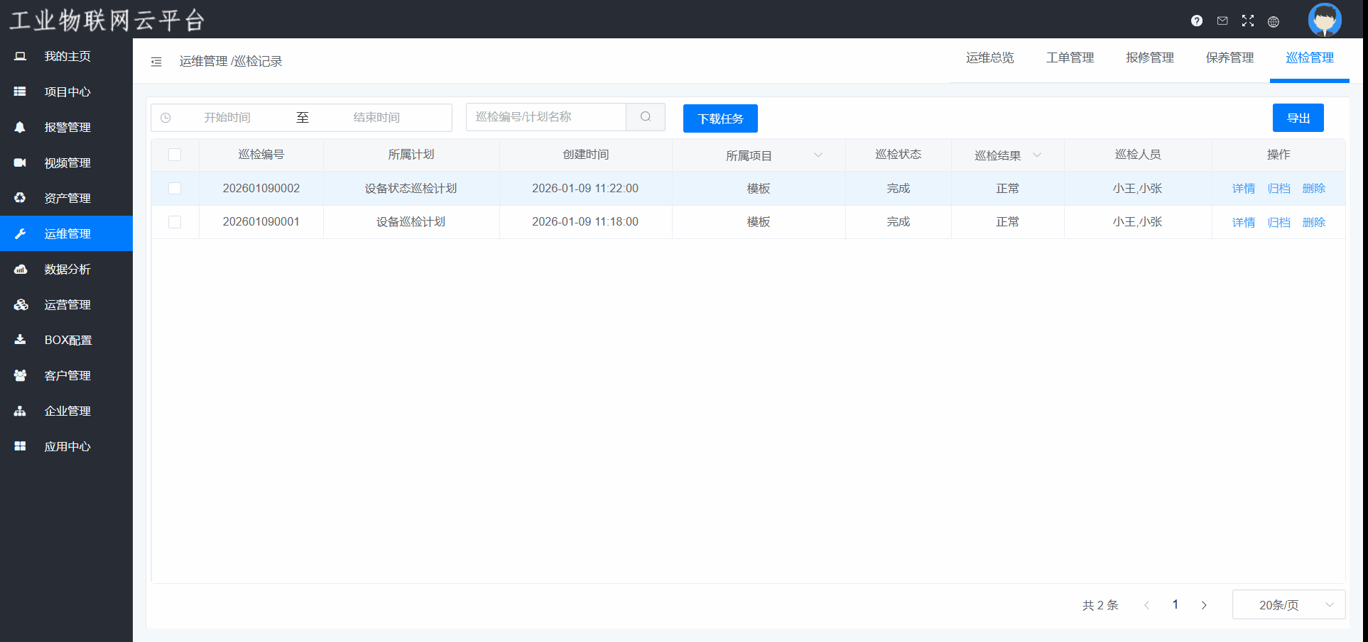 导出:全部巡检工单在一份表格内体现,点击导出后在下载任务内等待下载;