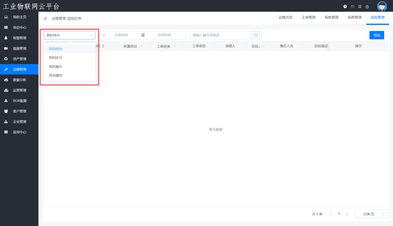 我的经办:我已经处理完成或者放弃的巡检任务;如果我是企业管理员,那么显示该企业所有的巡检任务;