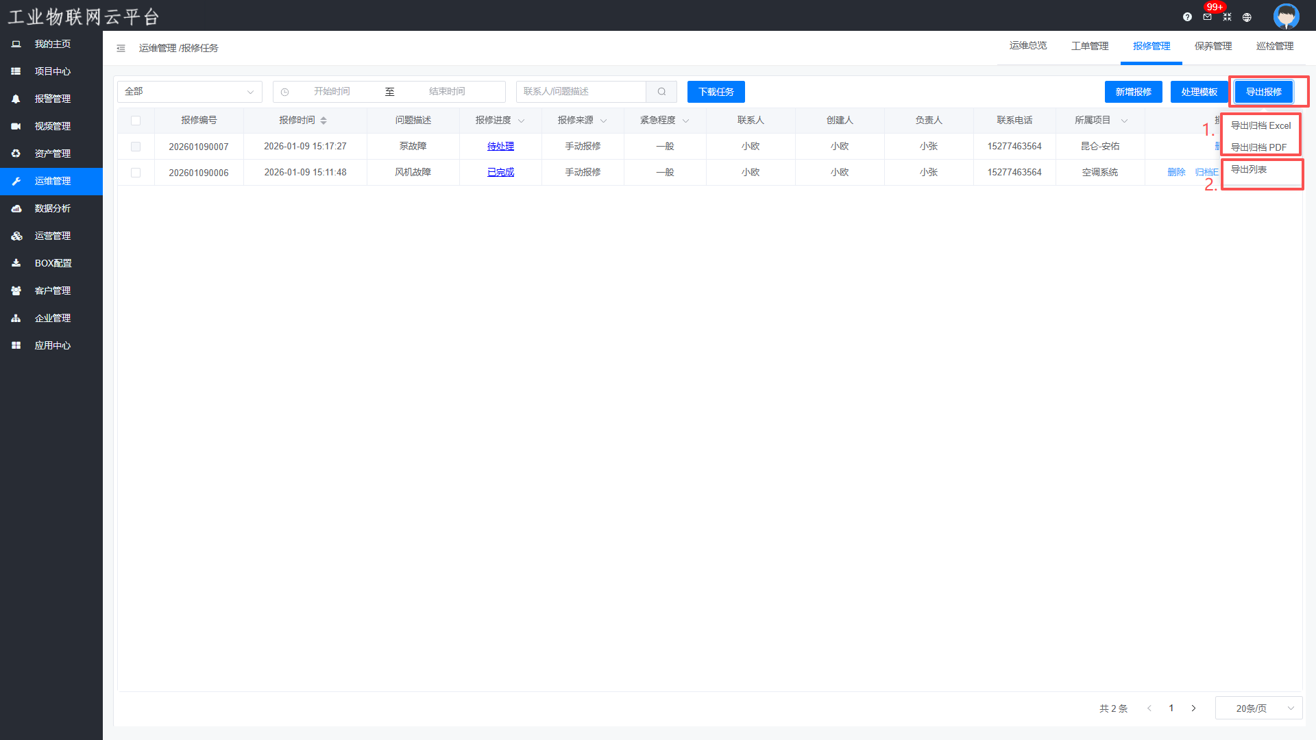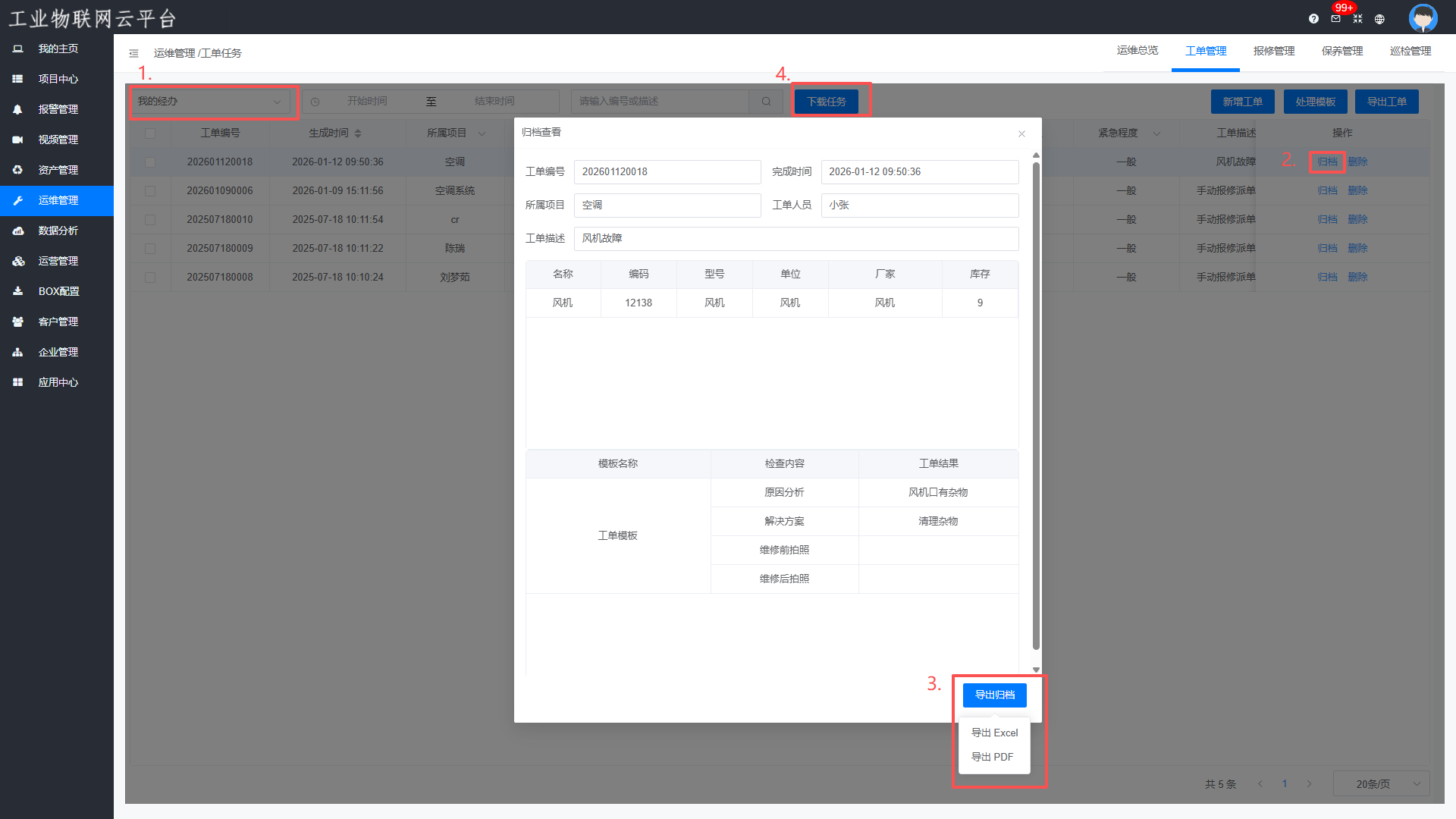 导出归档Excel/导出归档PDF:可将全部报修工单归档为Excel或者PDF,点击导出之后在下载任务内等待下载;
