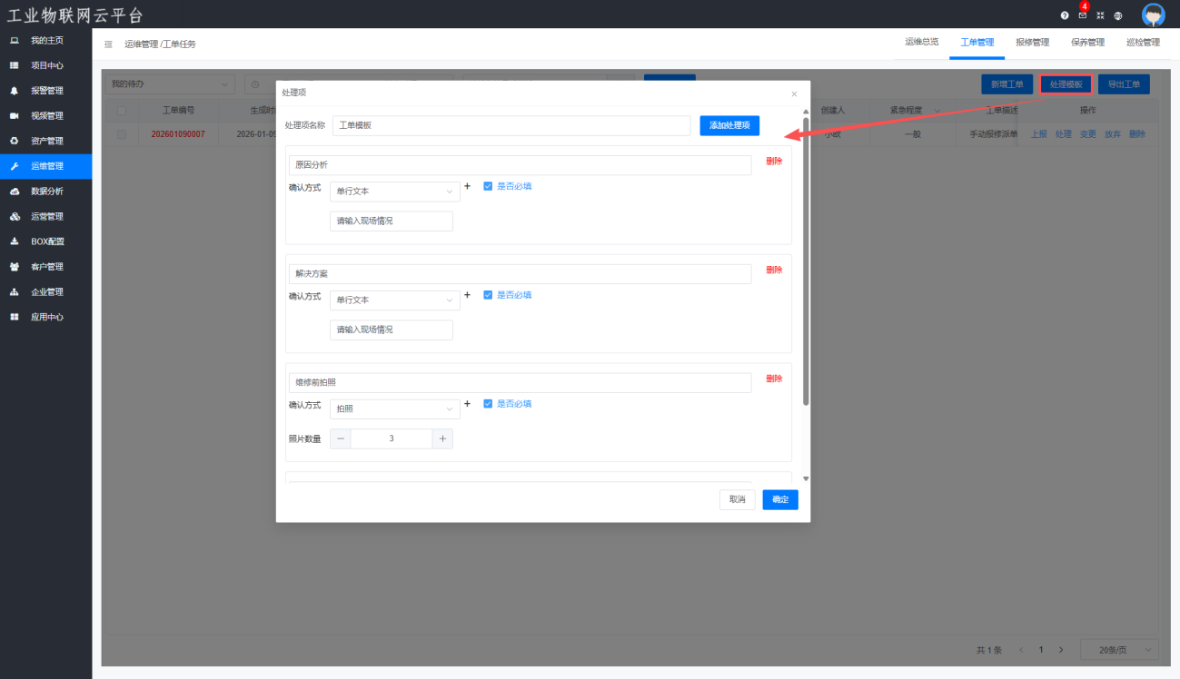 巡检内容:工单处理时需要填写的内容;需要先在巡检管理—>巡检内容进行填写;否则下拉单为空;