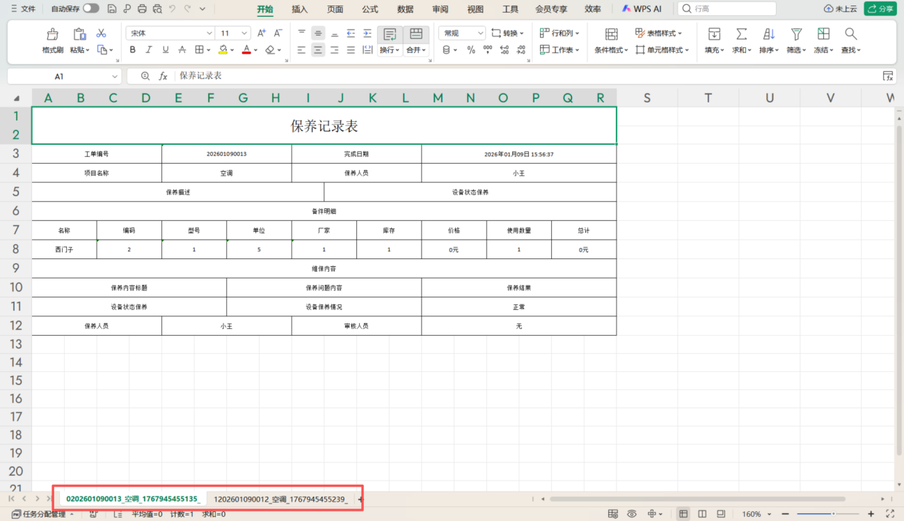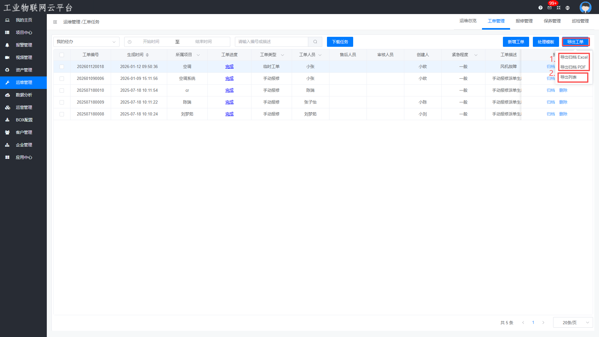 导出:全部保养工单在一份表格内体现,点击导出后在下载任务内等待下载;