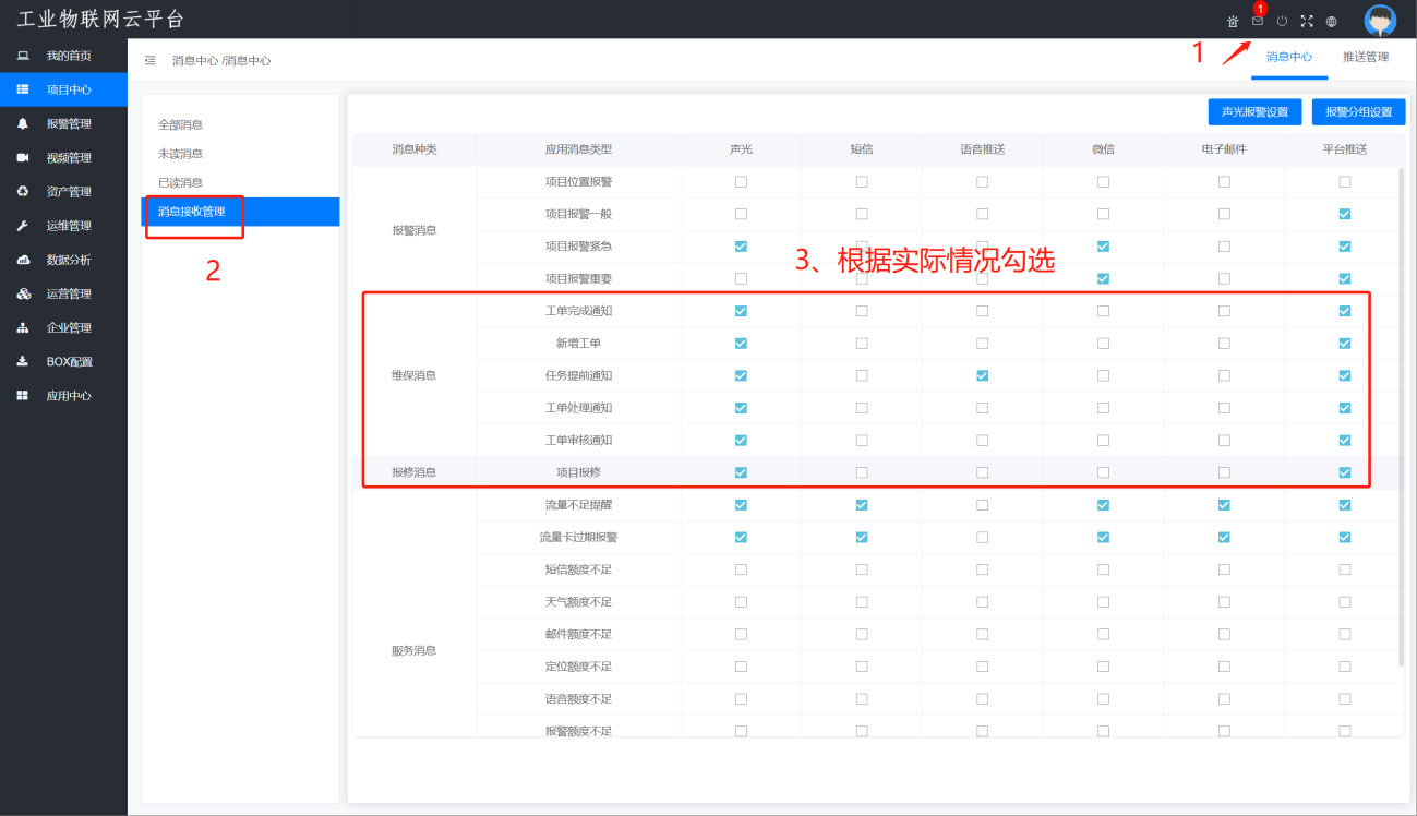 点击【消息中心】—>【消息接收管理】勾选要推送的消息类型和接收平台。