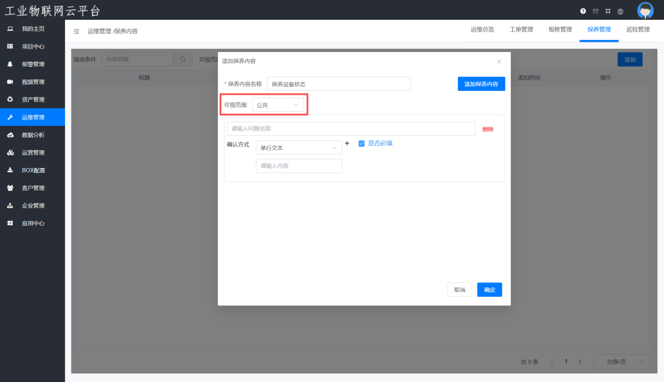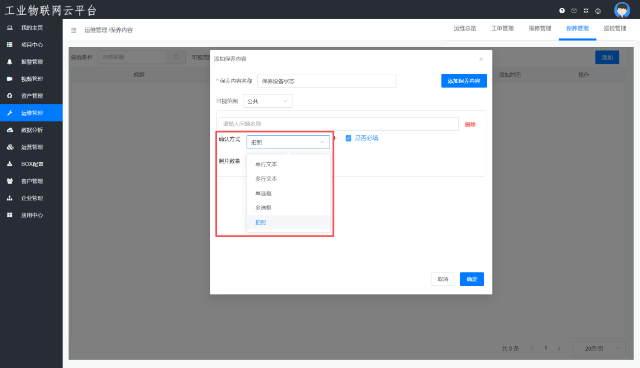 添加保养内容:输入保养内容名称,确认方式,是否必填;