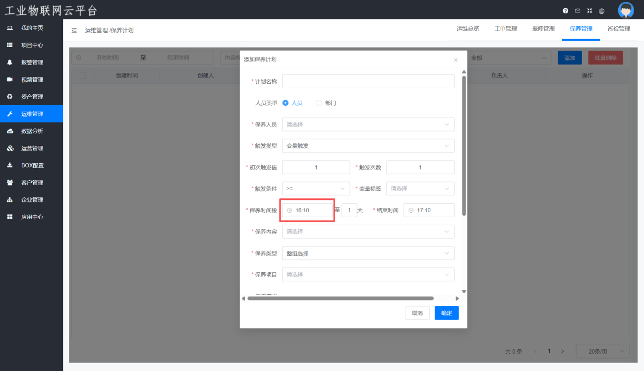 变量触发:适用于通过运行时间、运行次数、运行寿命触发维保,每天0点左右判断当前值是否满足条件,满足条件后在设置的保养时间段开始时间(比如下图的16:10)生成工单