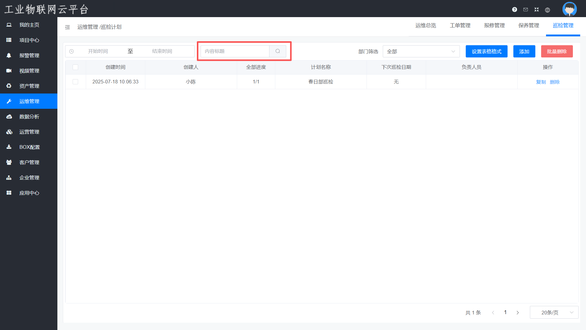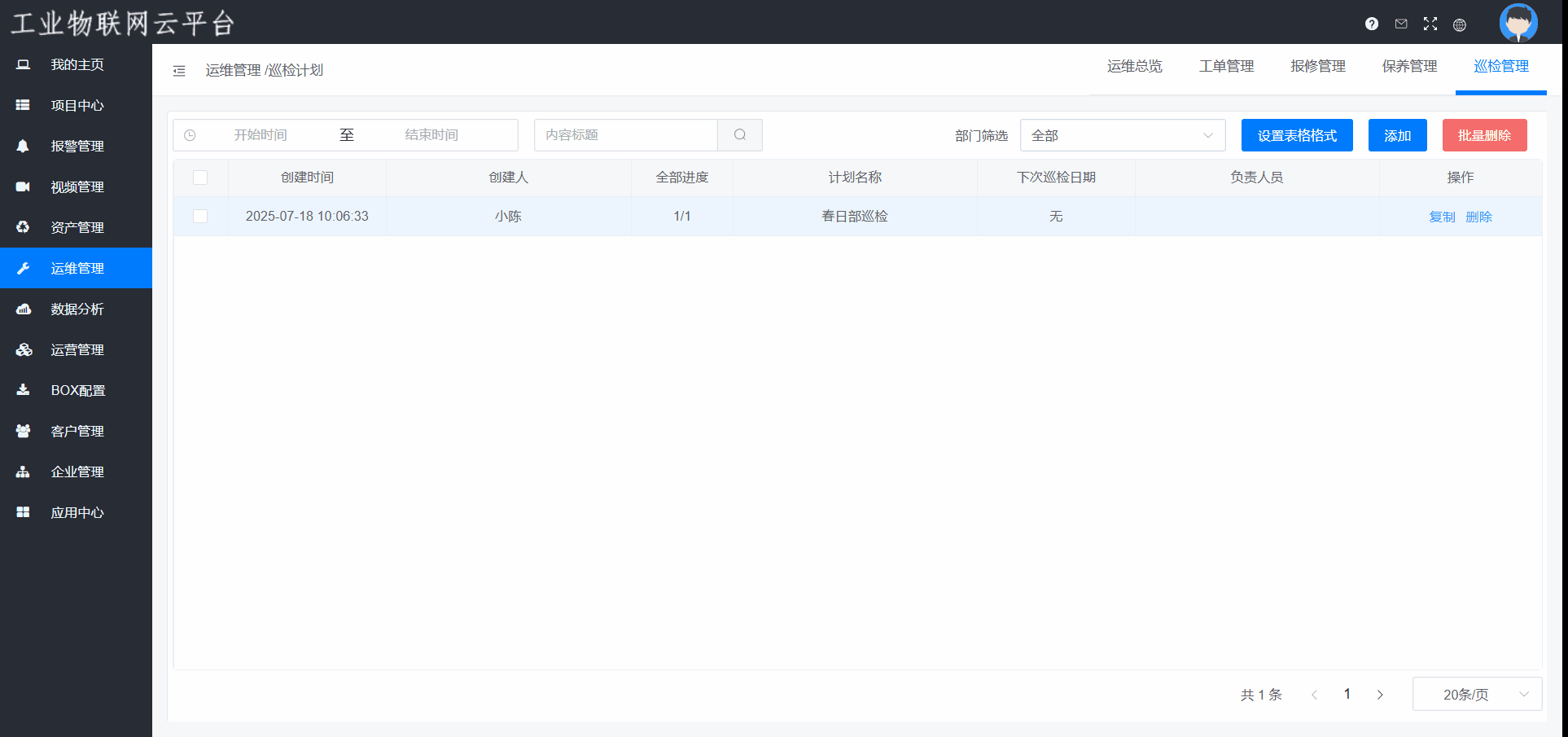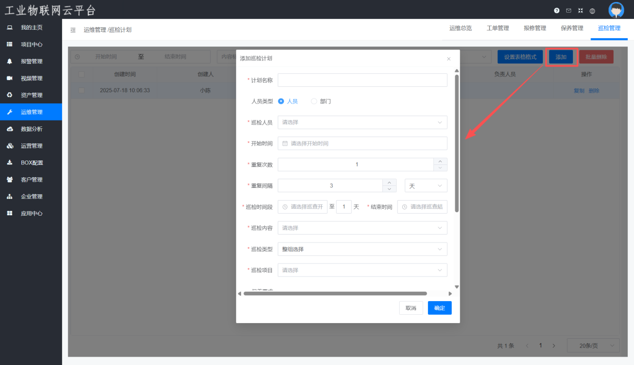 进入【巡检管理】—>【巡检计划】,点击添加按钮,操作步骤如下: