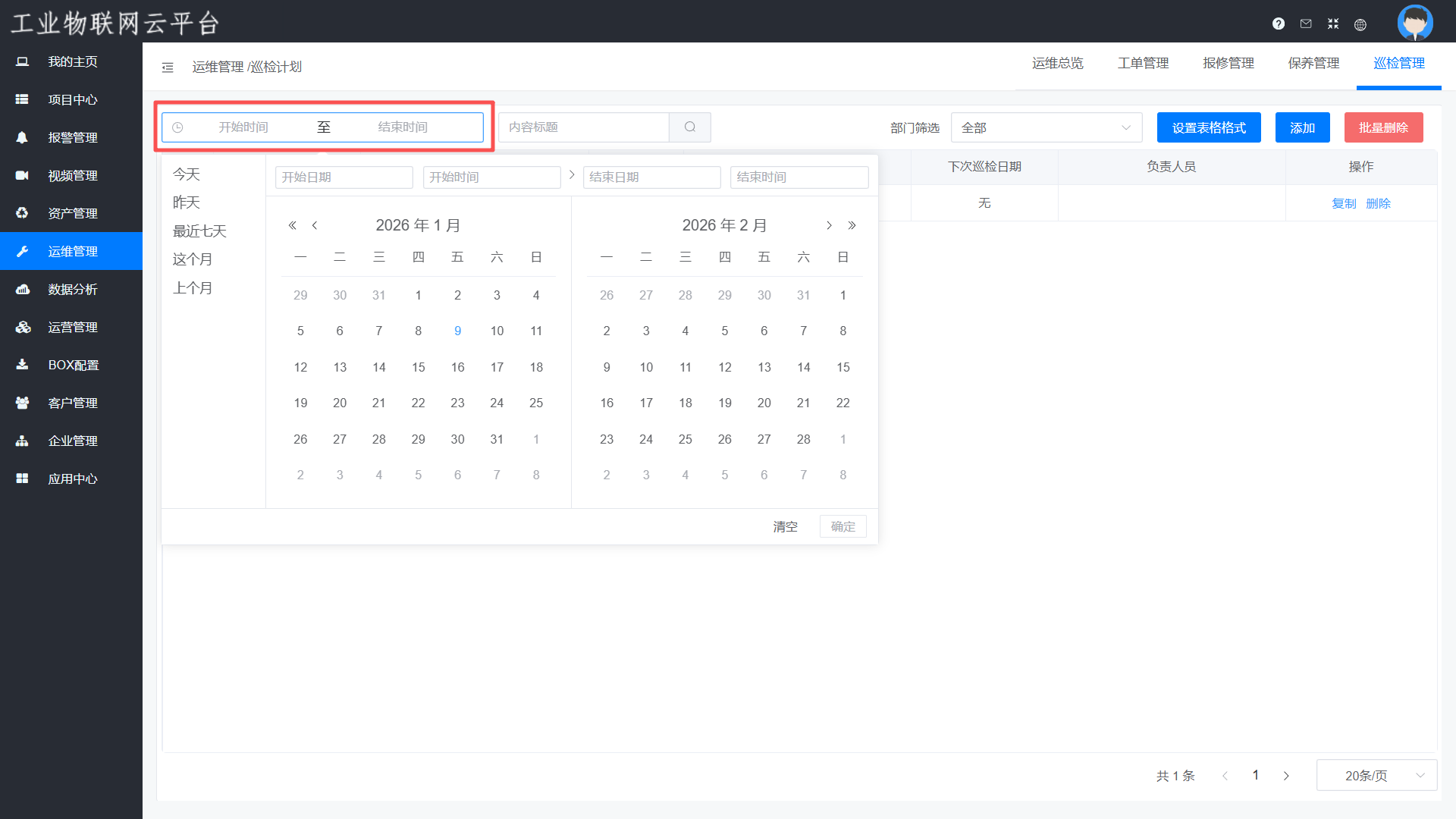 巡检时间段:负责人处理工单的时间段;在设定的时间段内完成工单算准时完成,否则是超时完成。