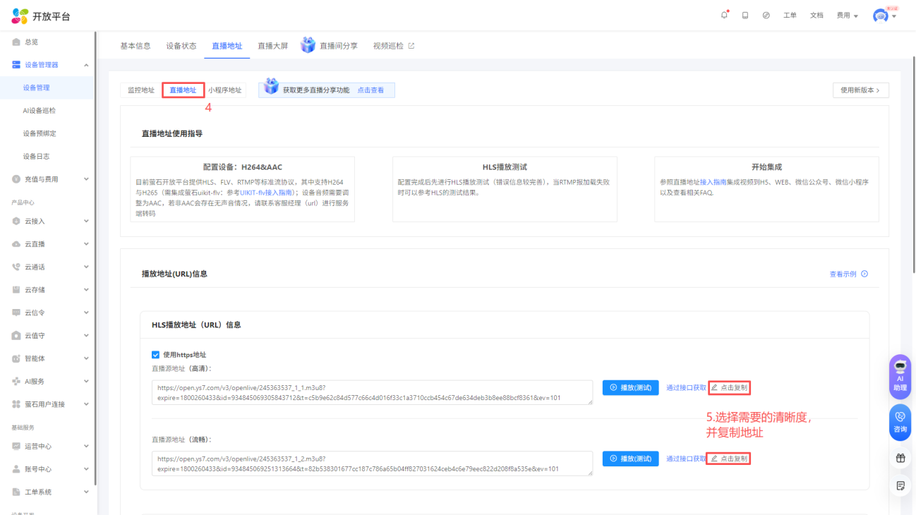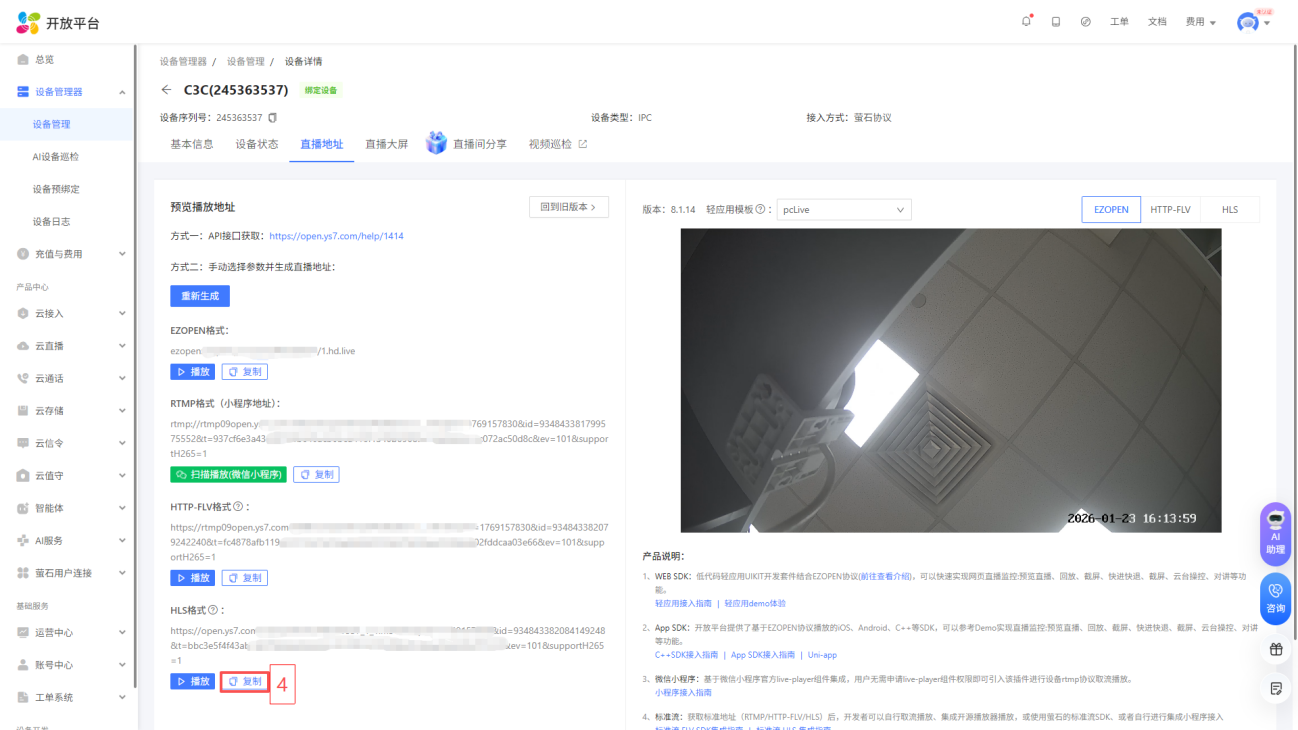 进入控制台页面后, 点击设备管理器-设备管理,选择您将使用的设备, 点击“视频直播”,选择HLS格式地址,然后点击复制,在云平台填写(设备与萤石云之间的绑定请查看说明书或咨询客服)