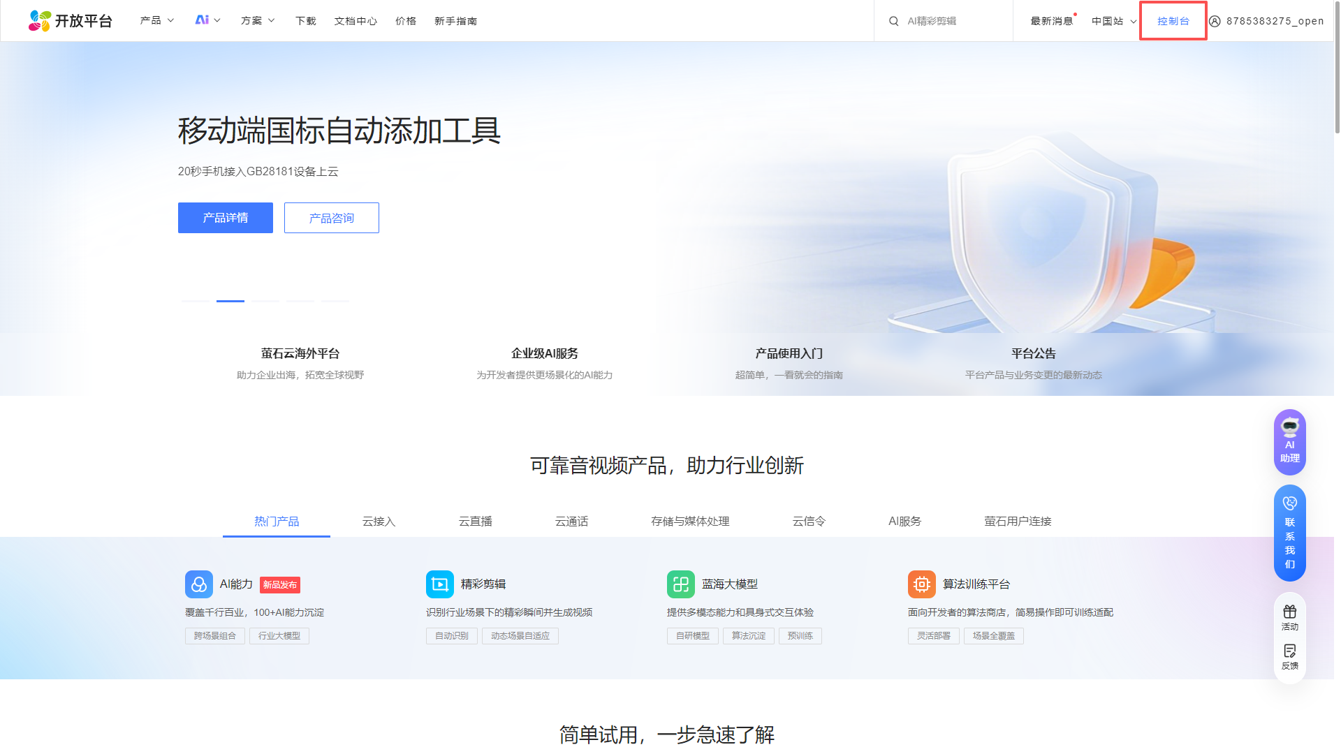 进入萤石云开放平台:https://open.ys7.com/,点击右上角登录。